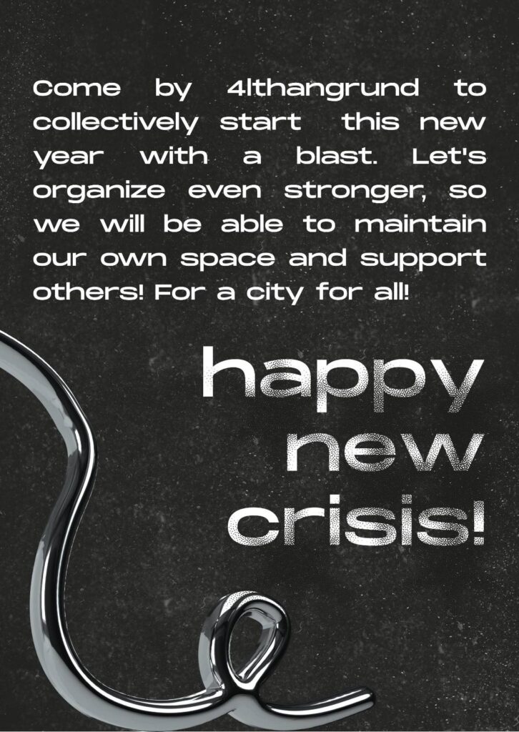 Come by 4lthangrund to collectively start this new year with a blast. Let’s organize even stronger so we will be able to maintain our own space and support others! For a city for all!