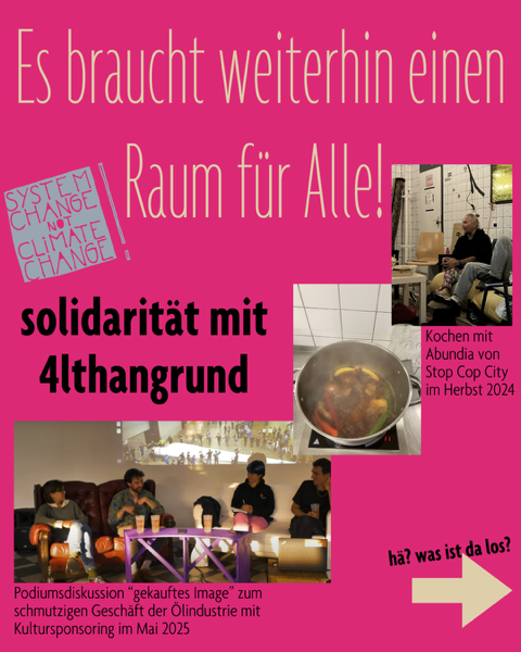 We are one of the groups that has actively used the rooms at 4lthangrund in recent years, at least since 2022. When there was only the Wolke, we held plenary meetings and public events there, and since the old canteen has been available, we also enjoy meeting there as a group about once or twice a month. We mainly use the rooms for internal meetings. From time to time, however, we also organise public events at 4lthangrund. Last year, for example, we held an information event and cooked together with visitors from ‘Stop Cop City Atlanta’ and held a panel discussion entitled ‘Bought images: the dirty business of cultural sponsorship’. We also enjoy attending other events that take place there, such as film evenings or the educational workshops organised by ‘tipping points’ in 2024.