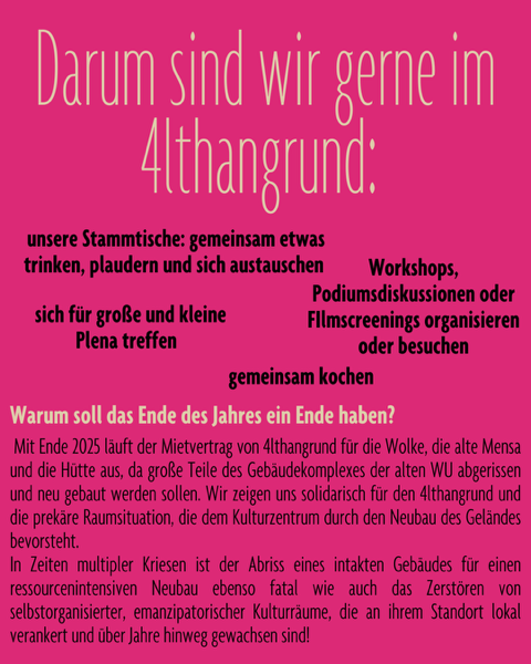 Insgesamt bedeutet uns das Kulturzentrum 4lthangrund sehr viel – es ist ein wichtiger und schöner (Lern-)Raum der Begegnung und Solidarität, der kollektiven Organisierung, bei der alle sich einbringen und mitgestalten können. Und der in den neunten Bezirk hineingewachsen und dort mit uns verwurzelt ist. Wir wünschen uns viel mehr solcher Räume in Wien!