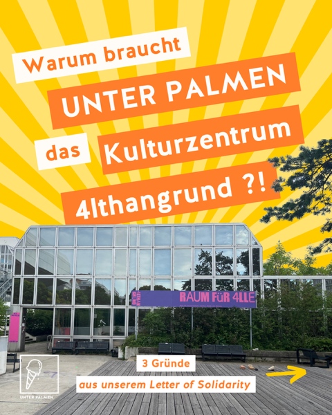 UNTER PALMEN braucht das 4lthangrund Kulturzentrum! Nur wenn wir Raum zum Sein haben, haben wir auch Raum, Ideen zu entfalten, Wissen weiterzugeben und zu einem solidarischen Wien beizutragen.