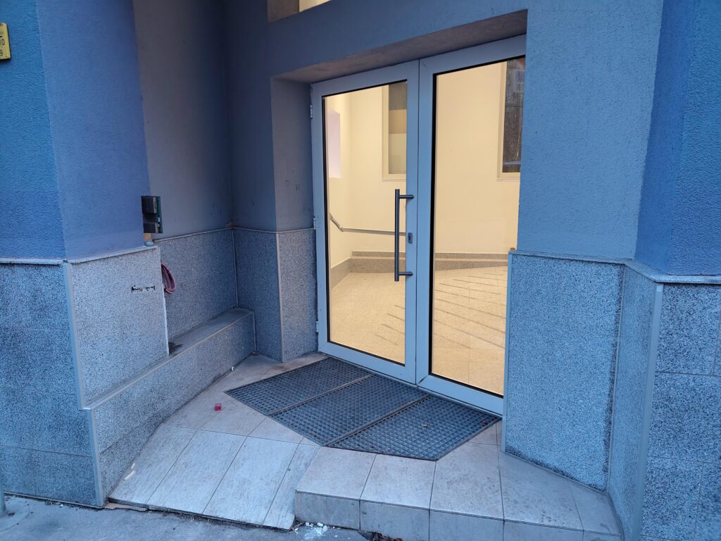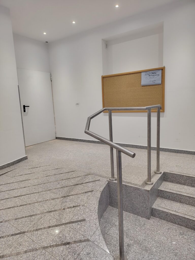 Die Stiegen hinunter ist der Haupt-Eingang des Kulturzentrums. Der barrierearme Eingang befindet sich ebenerdig weiter hinten über eine silberne Rampe. / Down the stairs is the main entrance to the cultural centre. The low barrier entrance is at ground level further back via a silver ramp.